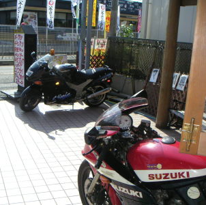 私はバイク一番乗りだったご褒美?? ZX−11を停めるのにマスターから指定された所は1台だけカメラに映るかもしれない場所だった。 店内に入りいつもの窓側の席に座る。面白そうなので取材を見てから帰宅する事に。 (← 手前はマッハVマスターご自慢の世界に8台しかないと言われているイタリアスズキが製作したカタナ。) |