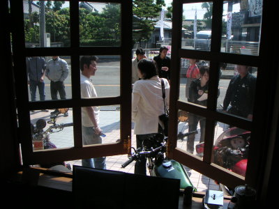 9時過ぎ取材陣到着。フッ君も登場。シブがき隊の頃よりもお腹が少し出てきたようだが、あの髪型はそのまま。撮影前にマスターのバイクを観ながら談笑。なんでもバイクが好きらしい。 (← 店内のこの席から取材の様子を見学させて貰う。手前左側がフッ君。) |