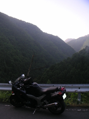 国道480号線〜国道370号線で九度山に降りていく。30分程の下り中低速ワインディング。 この道は傾斜がきつくなく、なおかつ道幅があるので重いZX−11でも、下りワインディングを結構楽しんで走る事ができる。 おまけに8時前で登ってくる車は多いが下りはほとんど無し。 気分良く九度山まで走る事ができた。