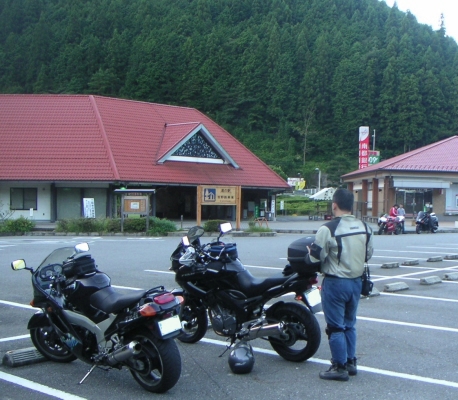 峠のトンネルを越えたあたりで、先程のDuacatiが追いついてきた。 すぐに道を譲ったらピースサインを出しながら豪快に追い越していった。ほどなく目的地の道の駅「吉野路黒滝」に到着。先程追い越していったDucatiが停まっていた。 私とTはお目当ての名物こんにゃくを食べて一息いれていると、あの黒のスクーターも到着。