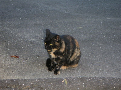 バイクを停めていた駐車場にいた黒と黄色のブチ猫。人懐っこく近寄ってきた。カラーリングがTのTDM900とそっくり。 |