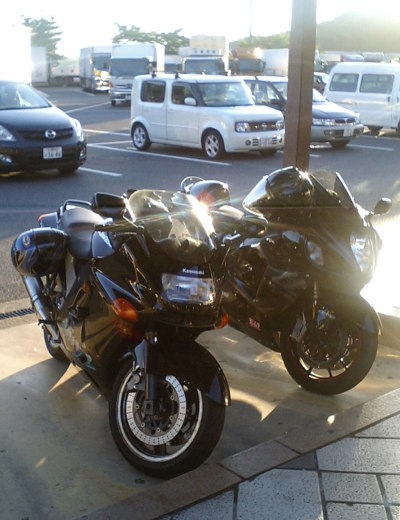 第1集合場所で指定されたのは岸和田SAに6時。普段よりは1時間もゆっくりできるとあって、ついつい油断し起きたら5時前だった。急いで準備し5時20分出発。泉北1号線経由で岸和田SA到着は6時ギリギリ。先に停まっているバイクは見慣れた黒い隼1台。食堂に行くと黒隼氏が朝定食を食べていた。