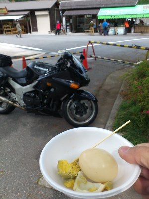 県道257号は確かに走れた。が、ところどころ湧水が道にあふれていた。落ち葉・落石もあるのでやはり普通のオンロードバイクではあまりお勧めはしない。素直に309号に戻る方が得策か。でも距離は短く県道48号まで出れば吉野杉の林を抜けるいやしルート。黒滝は9時前に到着。こんにゃくはやっぱり美味しかったし、煮卵というメニューも増えていた。単におでんの卵なのだが、これまた美味しい。100円で2個とリーズナブル。こんにゃく3本、煮卵1皿食べて満腹。Rip氏達も長者環トンネル経由で廻ってくるらしいが、とても待ってられない(11時まで帰宅しなければならない)ので、9時20分帰路につく。