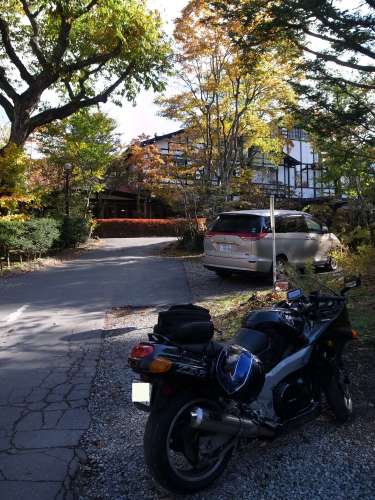 お昼過ぎ、草津温泉到着。バイクは草津町役場前の町営駐車場に停める。