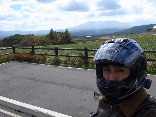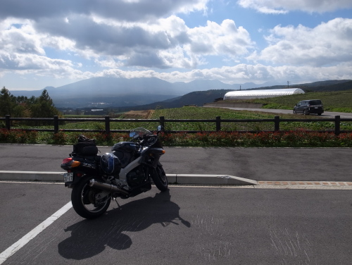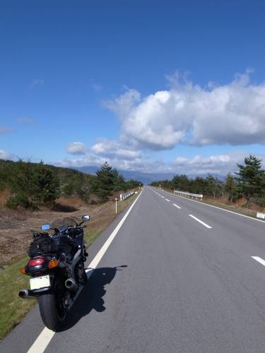 朝の軽井沢は曇り空だったが、ここにきて天気快晴。空は広く、どこまでも道はまっすぐ!雰囲気的には九州・九重高原辺りに近いかな。何組もバイク集団が追い抜いていく。