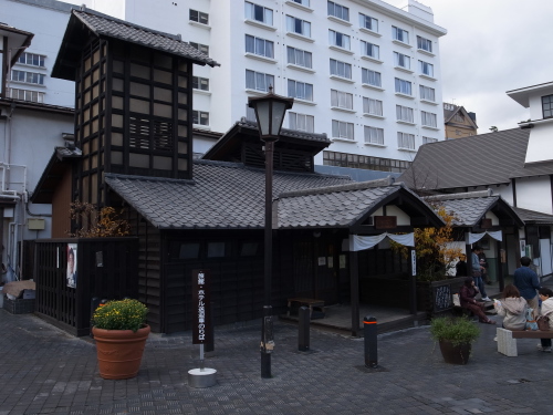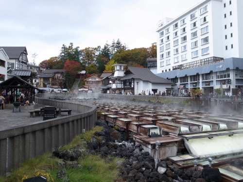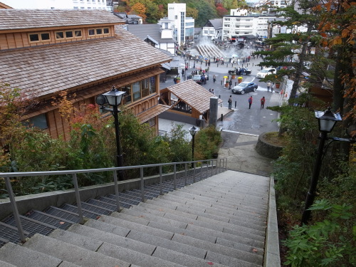 駐車場の階段を下りると、すぐに湯畑。左側の木造の建物が4月にオープンしたばかりの町営「御座の湯」。普通に風呂につかるだけだったら500円だが、大広間や家族部屋がある。愛媛の道後温泉と同じようなシステム。 | |