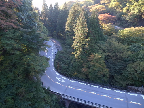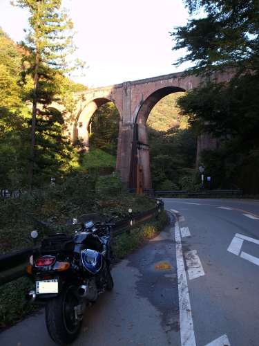 橋の上から国道18号を見下ろす。遠景で自分のバイクを眺めると 「ああ、旅をしているんだ・・・」と自己陶酔に浸れる(笑)。実際この国道18号は碓氷峠を越えていくのだが、軽井沢までの下道メインルートなのにも係らずこの時間帯車がほとんど無く、中山道の峠越えをバイクで味わう事ができた。