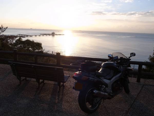 今回の朝駆けレポートはほとんど前書きがすべてかな。「ライダーたるもの寒くても走らなければ!」と単純に番組に感化されて目指したのは須磨公園。出発は6時45分。気温1℃。5号湾岸線を三宝ICから乗るも、路面は黒々としていて凍結直前。おまけに兵庫に入ってからは山からの吹き降ろしの風にあおられっぱなし。普段は交通の流れの中自在に位置取りできるのに、この時ばかりは高速道路上での最弱者。2日前にはケロが同じ道を走ってヘトヘトになったようだが、ブログに書いていた内容がそのままだった。途中何度もICを降りたい衝動に駆られながら、なんとか7時半須磨海岸到着。あまりに寒くてヘルメットさえ脱ぐ気にならなかったが、日の出には癒された。