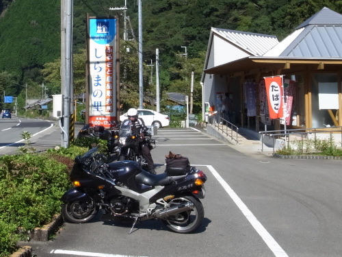 国道424号は毎度ながら快適そのもの。龍神方面から北上する事があまり無かったがどちら方向でも問題無く楽しい道だ、70kmの道程をみるみる消化していく。道の駅「しらまの里」到着は8時40分。駐車場を観ると、護摩山スカイタワー駐車場で見かけたシルバーのCBR1100XXが停まっていた。私よりも5分程早く出発していたが、まさか90kmも離れたこの場所で再び合流するとは。それにしてもどうやってここまで来たのだろう?普段はしないが、どうしても好奇心に勝てず所有者に話掛けてみた。