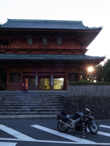 到着してすぐに、大門から降りてきた地元のおじさんに声を掛けられた。ステッキ片手のおじさん、毎朝の散歩が日課との事。「ふえ〜、九州から来たの!?」。福岡ナンバーを気に入って使い続けているので、時々そんな風に声を掛けられる。丁寧に堺からやってきた事を伝えると、大きなバイクだとやたら感心された。今や1100ccという排気量は何のプレミアもないのだけれど、バイクに乗らない方との会話の中では未だにそうやって驚いて貰えるのはちょっと嬉しい。
