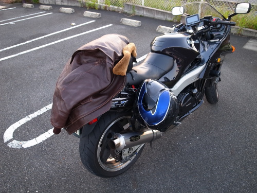 修理明けのG-1。ZX-11に乗る時は原則この革ジャンしか着ない(真夏の2ヶ月はさすがにメッシュジャケットにするが)。今日はインナーでTシャツと、クシタニのメッシュ・プロテクターベストを着てきたが紀見峠で肌寒かったので、シートバックに入れてきた長袖のシャツを追加で羽織る。