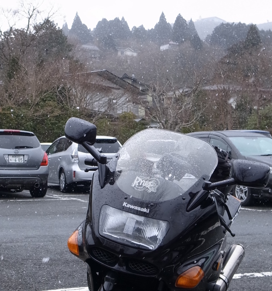 一通り勉強した後資料館を出てたまげた。チラチラだった雪が本格的に降ってきていた。「久しぶりの雪や〜」と感動したのも束の間。べちゃ雪では無く、ひとつひとつの雪がしっかり塊だ。これは積もるぞ、すぐに山を降りなければ。慌ててZX-11に戻り出発。5分も走らないうちに路肩が白くなりだした。気温表示を見ると-1度。これはヤバイ!