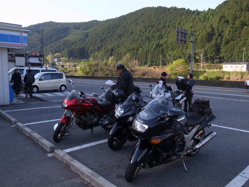 ローソン吉野リバーサイド店7時集合。久しぶりに黒隼氏にお会いできた。Rip氏主催の自由参加ツーリングという事だったが、今回はRip氏、ルーキー氏、くるりんさんとRYUBEメンバーが集合。ケロは用事がありここまで。