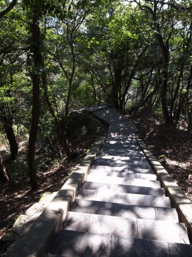 降りる階段。うっそうと茂った木々の中を石段がどこまでも延びている。 日本寺、ほとんど期待していなかったが良かった。「期待していなかった」というのは先程の竹岡式と同じだな。 日本寺を出発した後は県道34号を東に走り鴨川からは海岸線を北上する。 |