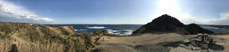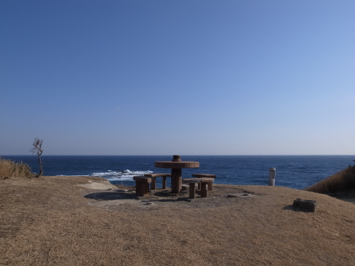 又吉氏が訪問した時とは異なって、風もそれ程強くなく快晴。 リアス式海岸の岬、風景は確かに綺麗なのだけど、これが”理想郷”? |