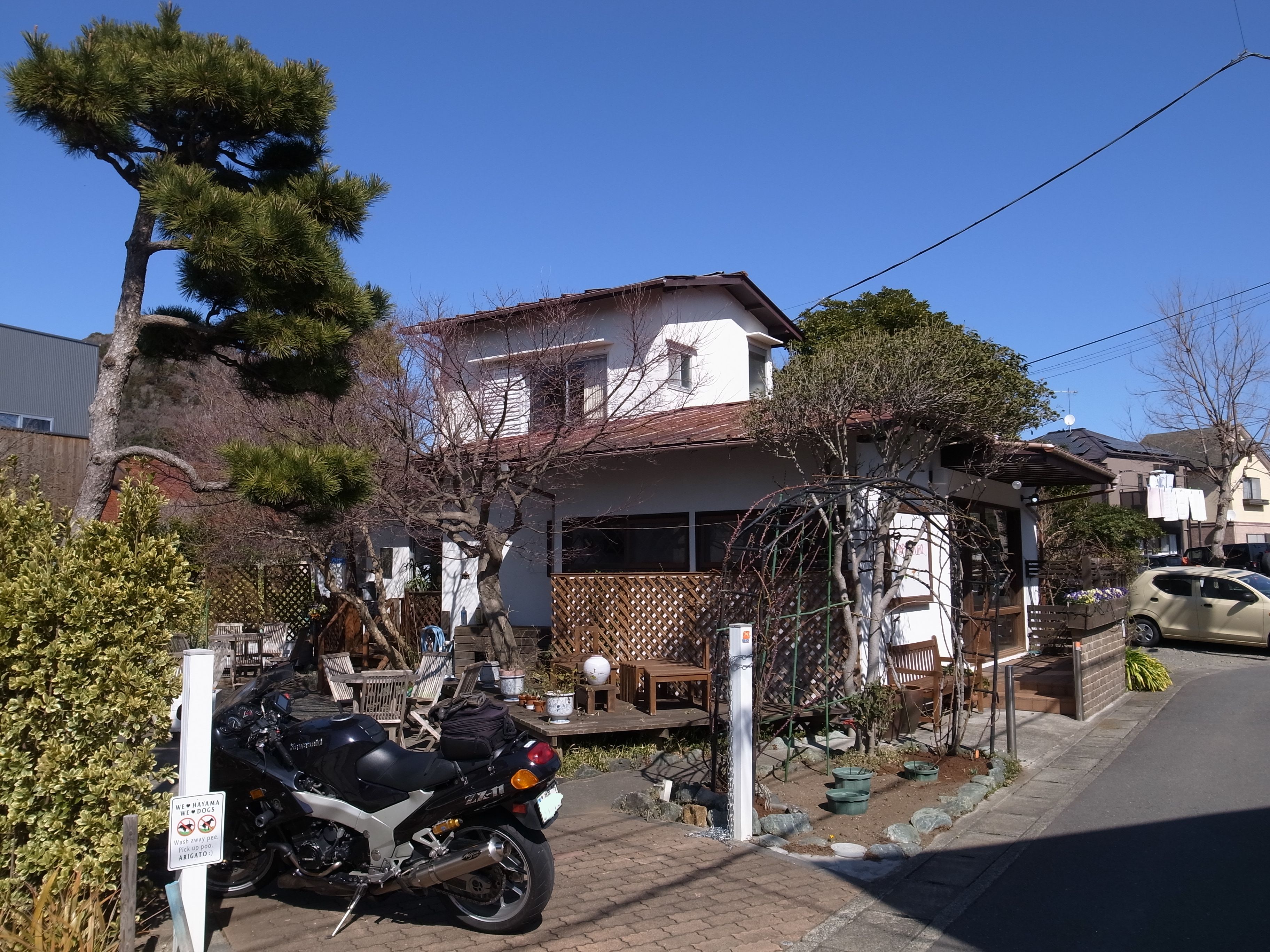 夜中の寒さは半端では無かったが、予報は快晴。この天気を見送るのが勿体無くて2日続けてのショートツーリング。距離を走る自信も必要性も無かったので、前々からの早朝カフェ探索を目的とする事にした。気温が落ち着いてくる9時出発し、目指すのは葉山御用邸近くの喫茶店 「パッパニーニョ」。サッカーの元日本代表監督、二宮寛氏が営んでいる店、というのは訪れた後に判った。