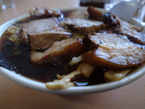 一口スープを飲んで、チャーシューを頬張り、変な麺を食べた頃には・・・・「美味しい!」。チャーシューは絶品、麺はこれはこれで他では食べれない(後で調べてみた。乾麺を使っているらしい)。真っ黒なスープは見かけ程ベタベタでは無く、ほのかにかつおだしの香りがする。オンリーワンという視点でみると、非常に個性的。
