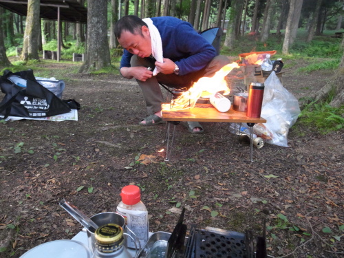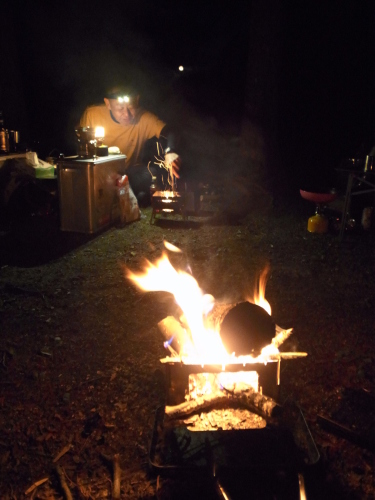 ヤッシャーさんが、テーブルを燃やしながら火をつけていた。上小川でご一緒したくりさんも同じテクニックを駆使されていた。私は持ってきた炭になかなか火がつかない。炭への火のつけかた、ついた火の確保等々は、ぜいろくさん、JUNさんに教えて頂いた。なんとか肉にありつけるようになった頃に日が暮れた。