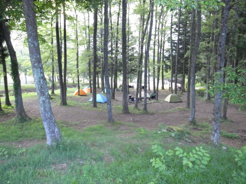 早朝のサイト。こんな森の中の綺麗なサイトが一泊 \ 1,000-なのだから素晴らしい。ちなみに温泉もトイレもとても綺麗だった(温泉は別料金)。