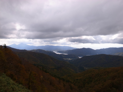 下りに入ったところで抜群な景色。遠く磐梯山と桧原湖が観える。