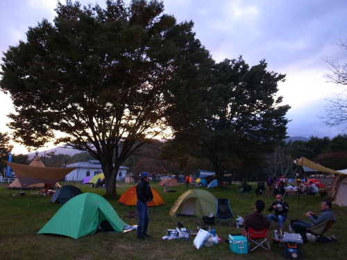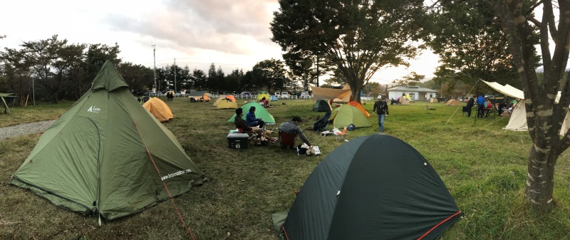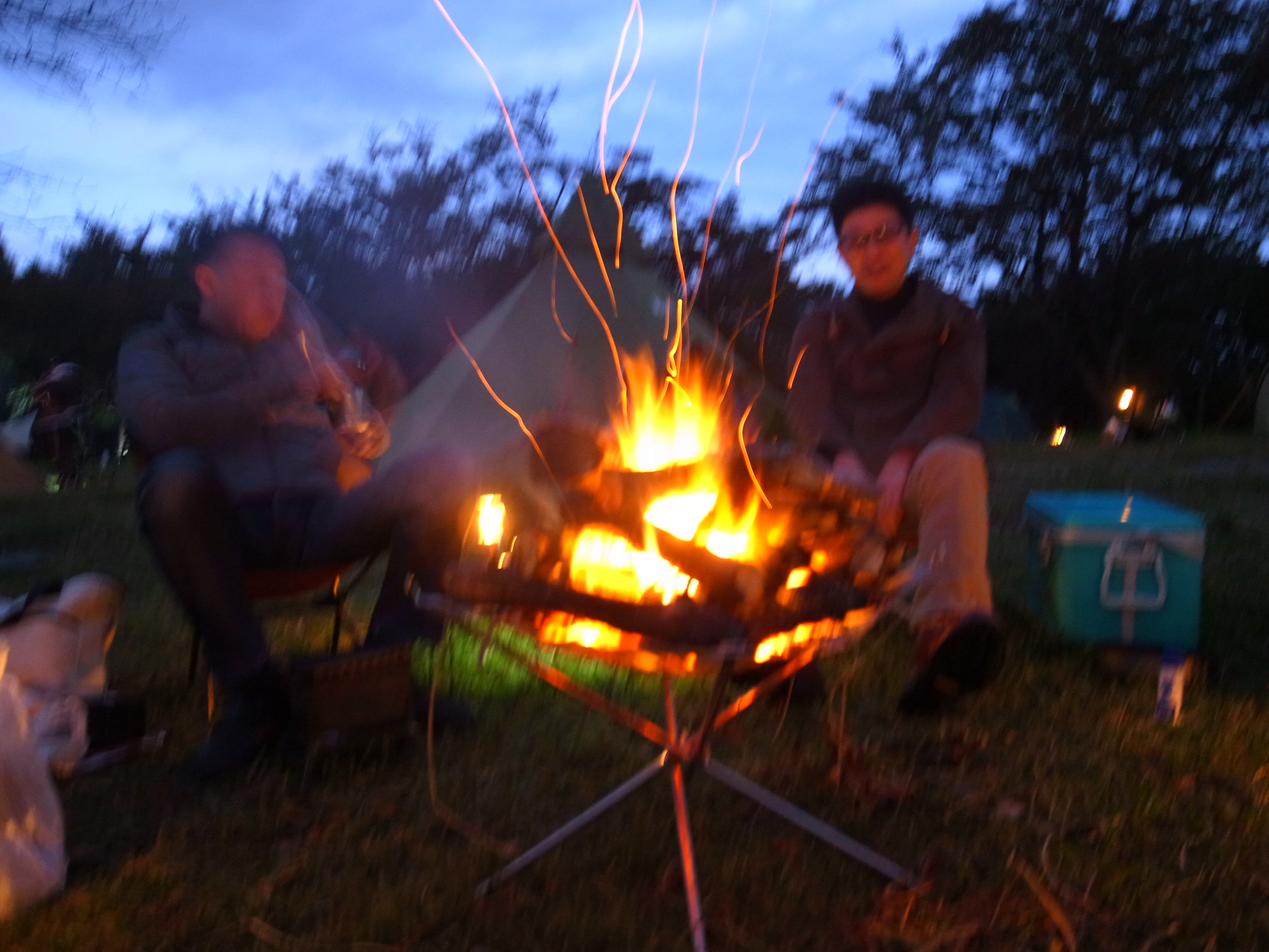 安達太良高原キャンプ場到着は15時。まだ誰も居なかったので二本松ICまで下りて買い出し。戻ったらrenさんと白うさぎさんが到着済。市営で無料のキャンプ場とは思えない綺麗なサイト。人が少ないと聞いていたが、この日はほぼ満員状態。幸い先着のrenさんが良い場所を確保してくれていた。テントを設営してホッと一息。焚き火用に薪確保に走る。暫くしてまれさんと黒テンさんも到着。