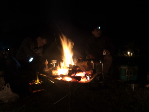 全員揃ったところで、焚き火。今回もファイアスターターを使って火付けに挑戦。・・・やっぱりダメだ、しかしここには心強いブッシュクラフト師匠・白うさぎ氏がいたのであった!!阿武隈高原同様、ほとんど師匠のお膳立てで再チャレンジ。さすが師匠、見事着火。白うさぎ・まれ両師匠の強力サポートにより、無事焚き火をおこす事ができた。