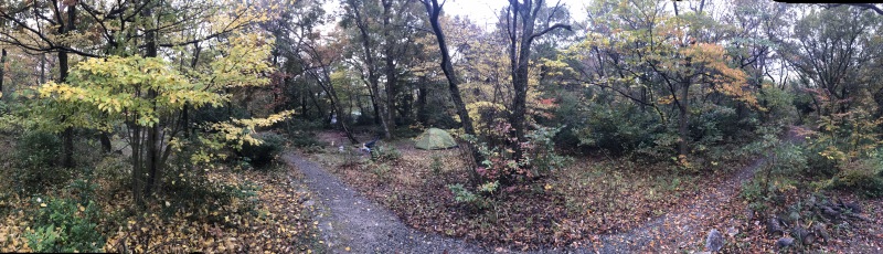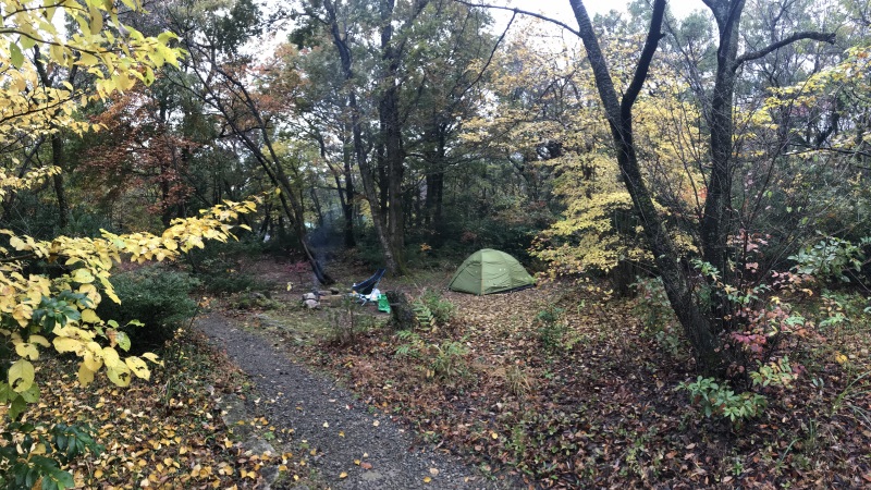 私が選んだのは森の小道沿いの9番。この日は客自体が少なかったが、9番は特に炊事場や広場から少し距離があって人通りが少ない。何よりの決め手はかまどの形と配置が一番気に入った事。設営は30分程で済ませて買い出し。戻ってきたら暗くなっていた。薪を確保した後、管理人から教えて貰った出湯温泉に向かう。