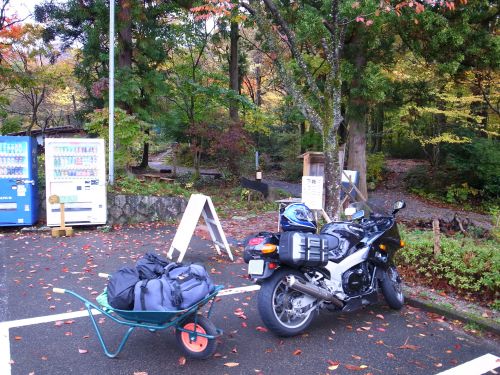 ここのシステムは面白い。受付を済ませた後にサイト地図を渡されて、一旦エリアを一周してくるように言われる。気に入ったサイトの番号を決めて戻った後受付票を受け取って設営をする、というシステム。サイト内は車両乗入できないが自由に一輪車を使う事ができるのはありがたい。薪は一束 \ 300- か 取り放題 \ 500-。 薪は一束作れば無料になるというのも面白い。