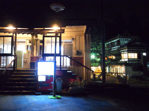 ”電気山道”と呼ばれる小道。距離は1km、15分程と聞いていたが外灯は無くモンベルのヘッドライトだけを頼りに真っ暗な森の中を抜ける。電池が切れたら間違いなく一歩も動けなくなる状況にビビりながら、温泉街の駐車場の灯りが見えた時はホッとした。