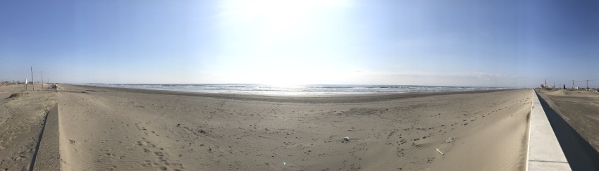 前日夜まで迷って、ギリギリで決めた目的地が九十九里浜。午後から天候不順予報で半日で往復できる場所、そしてスパッと気分転換できる場所という事で選定。見立て通り、7時20分出発して、東関東道〜京葉道〜千葉東金道路を経由して1時間後には豊海漢学j到着。ウィンドサーファーは居なかったが、結構なうねりが入っていてサーファーが出ていた。