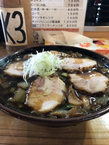久しぶりに自立した存在感のある猫と遊んでいるうちに開店。アリランチャーシュー麺。竹岡式と同じく汁は黒く、見栄えを良くは無いが、こくのあるスープ、柔らかなチャーシューが美味。名称からしてぶっ飛んでいるかと思ったが、普通に美味しいラーメンであった。