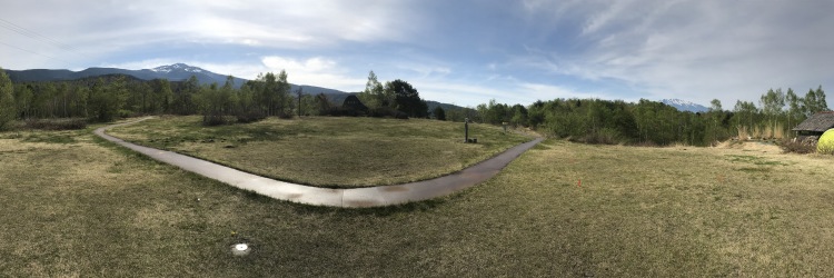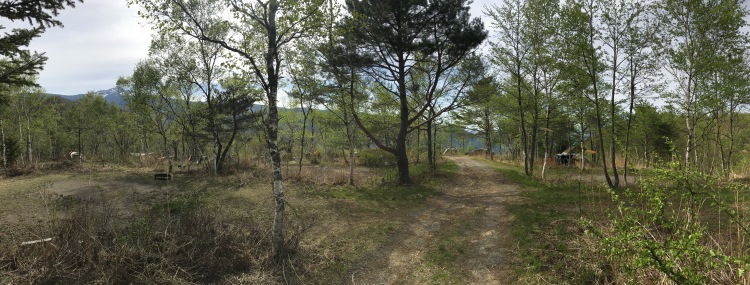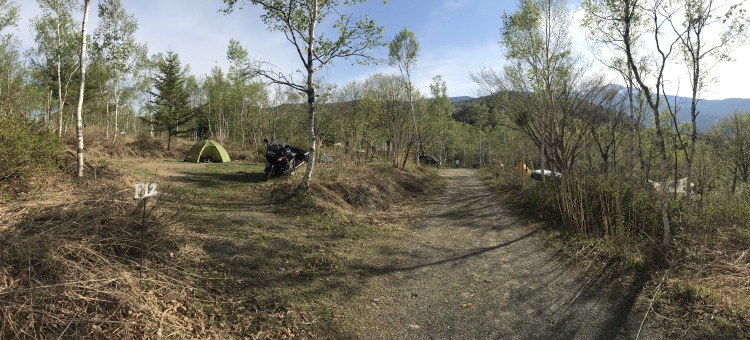 白樺並木が信州を感じる。事前リサーチ通りサイト1つ1つが充分な広さ。傾斜はきついし、足元も轍があったりして乗り込むには気を遣ったが、なんとか無事に予約していた”F12”に到着。乗鞍と御岳が両方一望できる一番人気のF21〜25には及ばないが、それに次いで各種HPで評価が高かったF12サイト。御岳は直接見え難いが、乗鞍は目の前に開けている。