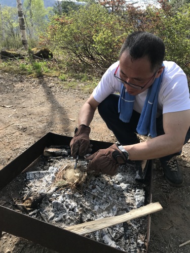 朝食の後、ヤッシャーさんが 「火起こしって面白いんですか?」と仰るものだから、体験して頂く事になった。セッティングをして、さあどうぞ!1回目は着火はするもののすぐに種火は消えてしまった。「火はつくんですけれど、育てるのは難しいんですよ〜」 とお伝えして、再度挑戦・・・。すると!? 何としっかり火がついて焚き火になったではないか! センスが良い人は違うんだな・・・。私の1年の努力って(笑)。