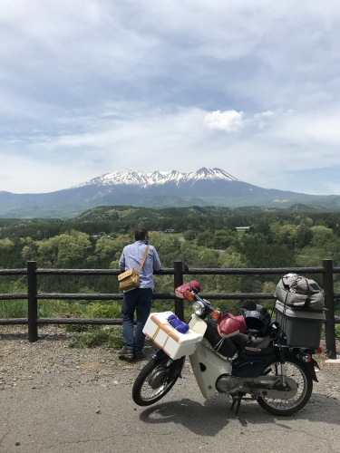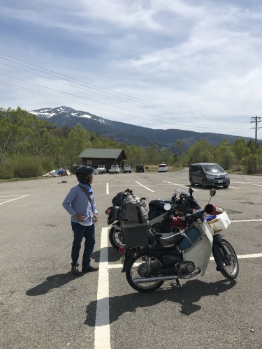 乗鞍が一望できる展望台で小休止。キャンプ仕様のカブが絵になる。