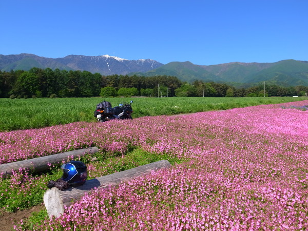 361号線、「権兵衛街道」を西に向かって走り始めたところで、鮮やかなピンク色に染まった花畑に目を奪われた。急ぐ必要も無いので暫し小休止。天気、景色ともに申し分無し。「ツーリングに出て良かった!!」