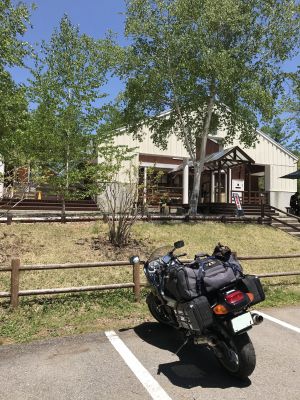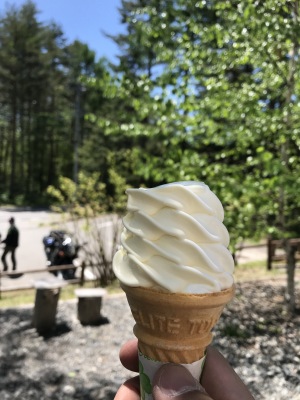 開田高原アイスクリーム工房。雑誌にも載っていたが、コーンの先っぽまでアイスが詰まっていてなかなか美味しかった。アイスを食べながら通り過ぎるバイクを観ていると、2台に1台はカウルに「SSTR」のステッカー。まさっちさんも週末参加すると言っていたが、凄い動員数だ。