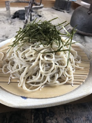 先程の十割そばに満足できずに、リサーチ済のもう1軒に寄ってみた。土日のみ営業をしている店。囲炉裏を囲んだ店内。外には御嶽山が目の前。ロケーションは抜群。蕎麦は・・・・。・・・・。う〜ん。これも先程と同じ感じ。美味しいんだけど、求めているものと違う。