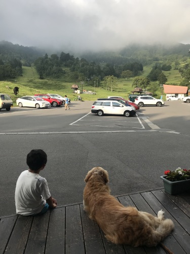 小さな牧場スキー場だが、リフト前には数件の店がある。ソフトクリームの看板と、高原が似合いすぎる犬に誘われて1軒の店に入る。犬の横で小学生が何かする訳でも無く牧場を眺めながらたそがれている。美味しいソフトクリームを食べながら、ゆっくりとした時間が流れてる・・・。声を掛けてみると、てっきりこの店の子だと思っていた小学生は斜め向かいのホテルの孫だった。毎年この時期に東京から遊びに来るらしい。この日の昼過ぎに電車で須坂まで来て、「おじいちゃんが駅まで迎えに来てくれた」そうだ。こんな田舎があるなんて羨ましいな〜。