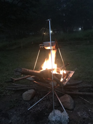 懐かしい雰囲気を味わっているうちに日が暮れる。今回は東北の先輩が使っていて、ren先輩も最近入手した焚き火台を使ってみる。3分割されるので運搬はコンパクト。広げると上の写真の通り。大きな薪もドサッと載せる事ができる。トライポットで初めてキャンプ場でお湯を沸かした。コンビニで買ったカップヌードル、生鮮食品が無く苦肉の策で購入したのだが、キャンプ場で食べるのは相当美味しかった。