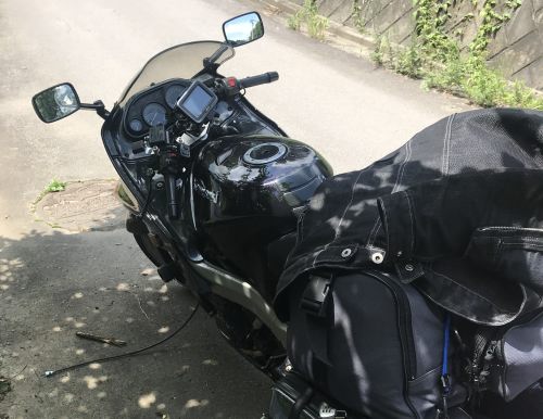 嬬恋村から万座ハイウェイに登る手前で、トラブル発生。スピードメーターが動かない。都井岬と同じ症状、前輪を観るとやはりメーターケーブルが脱落している。取り敢えず日陰にZX-11を停めて、さあどうしようか。都井岬では隊長からフル工具を借りてカウルを外し、周りの方の協力を得てなんとか復帰した。今回は最低限の車載工具+α程度しか手持ちは無い。