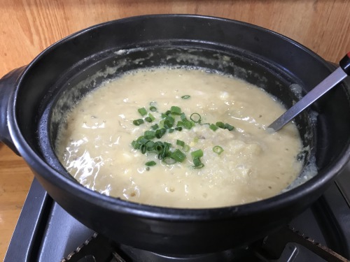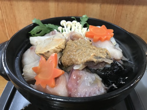 思わず美味しいスープを一気に飲み干してしまった。おかみさん、「本当は残ったスープで雑炊をするのですが・・・。」とちょっと困った顔。何と特別に少し肝を足して雑炊を作ってくれた。この雑炊は病みつきになりそうな奥深い味。あっさり系の味付けだが本場を満喫できて満足。