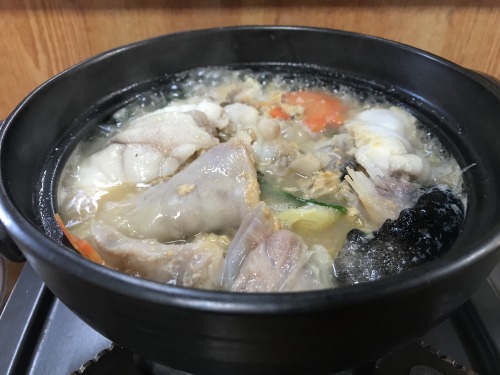 10分程煮込んで出来上がったのがこちら。見事に水分が出て鍋になった。あんこうの部材が色々入っていて楽しい。黒皮の部などはプリプリしていて本当美味しかった。