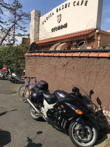 由比ガ浜〜材木座〜逗子海岸を走り、目的地の「なぎさ橋珈琲店」には10時半着。この店は朝7時から営業していて、ロケーション抜群。一度来てみたいと思ってようやく念願叶う。