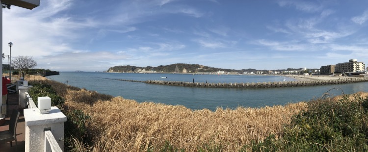 テラス席からの眺め。風は吹いていなかったがウィンドサーフィンが10艇程海に出ていた。遠く江ノ島も観える。1時間半程滞在して、やりたい事を済ます。