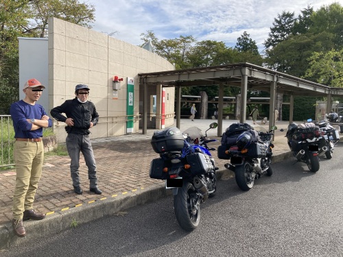 阿智PAの手前、恵那峡SA手前で前を走るrenさんがウィンカーを出した。中央道に入ってから工事渋滞が続いて予定より早めの休憩。バイクを停めて数分後、思い掛けず別行程だった黒テンさんが到着。全く偶然の合流だったようだ。ちなみにYAMAMOTOさん@ハーレーは給油の為小牧JCT手前で一旦高速を降りていた。YAMAMOTOさん抜けて、黒テンさん合流。この辺りは出発早々RYUBEっぽくてワクワク。