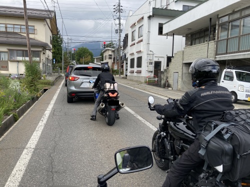 キャンプを始めた当初は撤収だけで2日目のエネルギーの大半を朝一番で使い切っていた。その頃に比べて随分とスムーズにいくようになった。ルーチンが出来た事もあるけれど荷物を減らした事でパッキングでぎゅうぎゅう押し込む頻度も減った事が大きい。キャンプ場出発前の雰囲気は結構好きだ。復路はrenさんを先頭に、YAMAMOTOさん、私、OKさんの4台で白馬を目指す。ぜいろく師匠に見送られて出発。