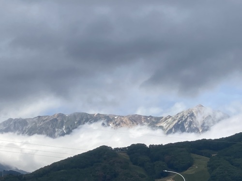 途中休憩したコンビニから一瞬、白馬連峰が顔を出す。昔renさんは学生時代にあの尾根伝いを縦走したそうだ。この景色が観られただけで今日はもう満足。