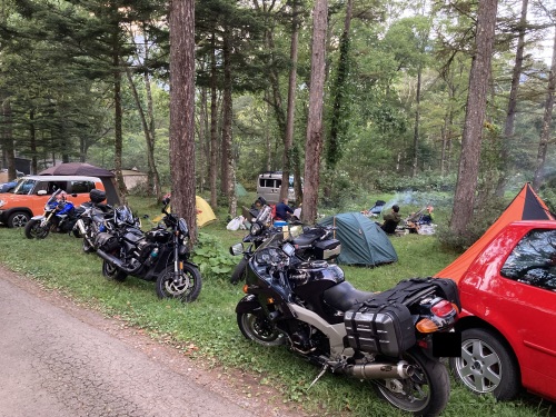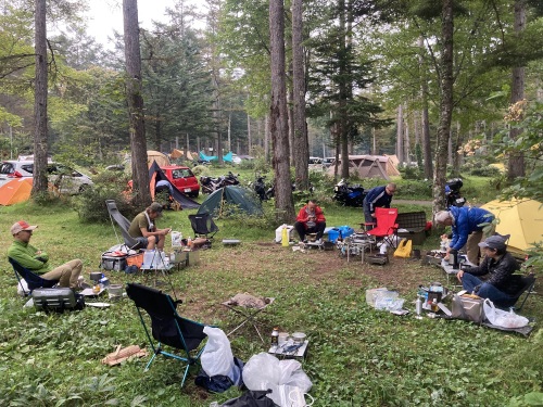 今回のメンバー。大阪からバイク組、主催者 renさん@ZZR1400、YAMAMOTOさん@ハーレー、黒テンさん@SUZUKI。車組はぜいろく師匠、初めてお会いするとしさん、OKさん。単身赴任中のJUNさんは三重県から。そして東京からお久しぶりのもりかめさん@SUZUKI。台風前によく9名も集まったもんだ。心地良い林間サイト、キャンプ達人諸先輩の楽しいお話、真面目な話、変な話・・・。静かで楽しい、ゆっくりだけどあっという間に流れていく時間。