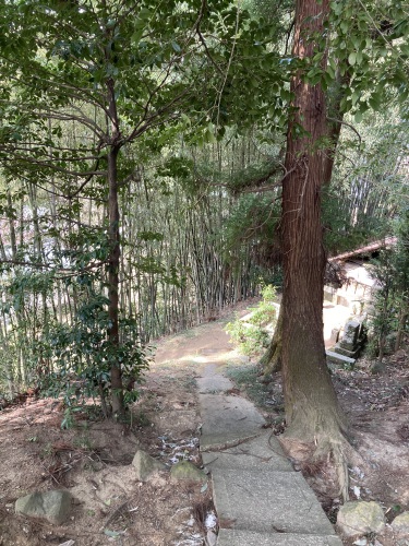 作業途中に裏山のお宮さんにお参り。傾いたものや立ち枯れしているものを間引いたので竹林がスッキリ明るくなった。この小さな小径は雰囲気良い。