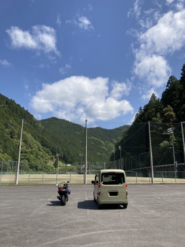 3日(日)。そのまま帰るのも惜しくて、バイクと車でミニツーリングをする事にした。行き先は道の駅「杉の湯川上」。ケロお勧めの滝があるらしい。火打餅ゲットと併せて目的地とする。辿り着いたのはなんとも爽やかな公園。癒し系の場所・・・と思いきや、奥に向かうと景色が一変。